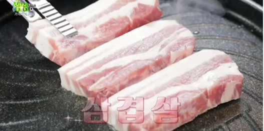 - 오늘의 메뉴는 육즙이 팡팡 터지는 냉장 삼겹살로, 보기만 해도 맛있어 보인다.